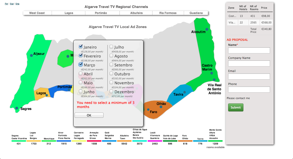 An HTML5 map based hotel TV ad rate calculator. 3 sites in 3 languages. The original versions were provided as a spreadsheet calculator and static maps. CakePHP was used to build the "back office", public pages and translations.
